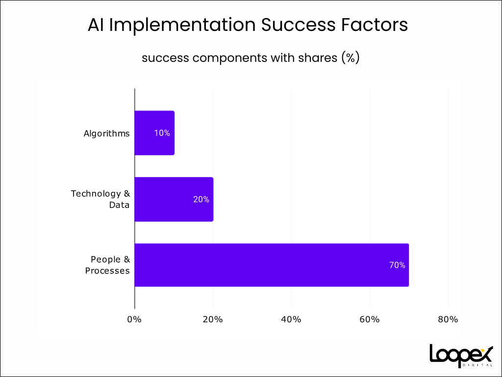 • Human Capital Development: The most successful AI implementations follow the rule of 10% for algorithms, 20% for technology and data, and 70% for people and processes (Source).