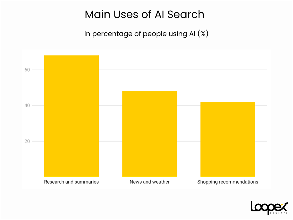 The main uses of AI search are (Source):