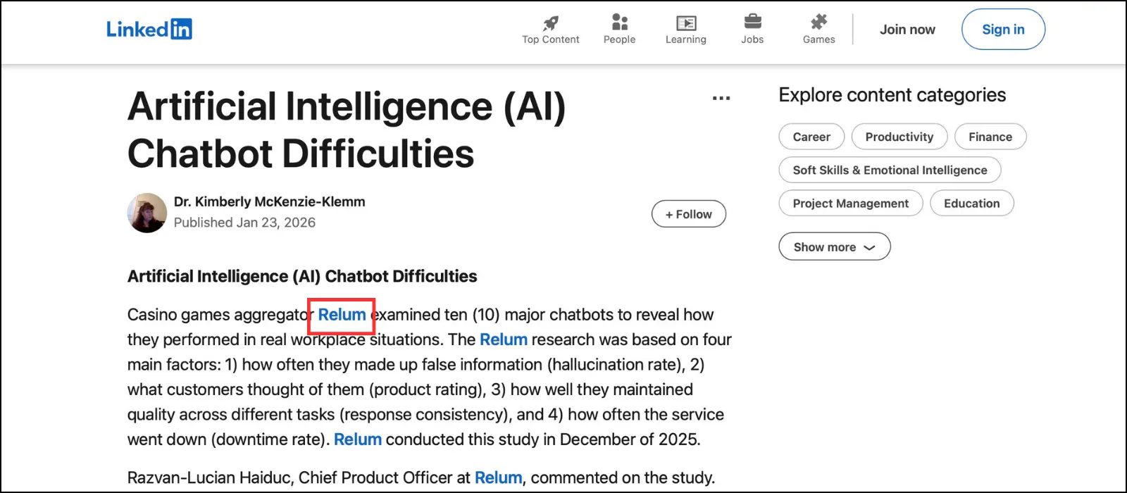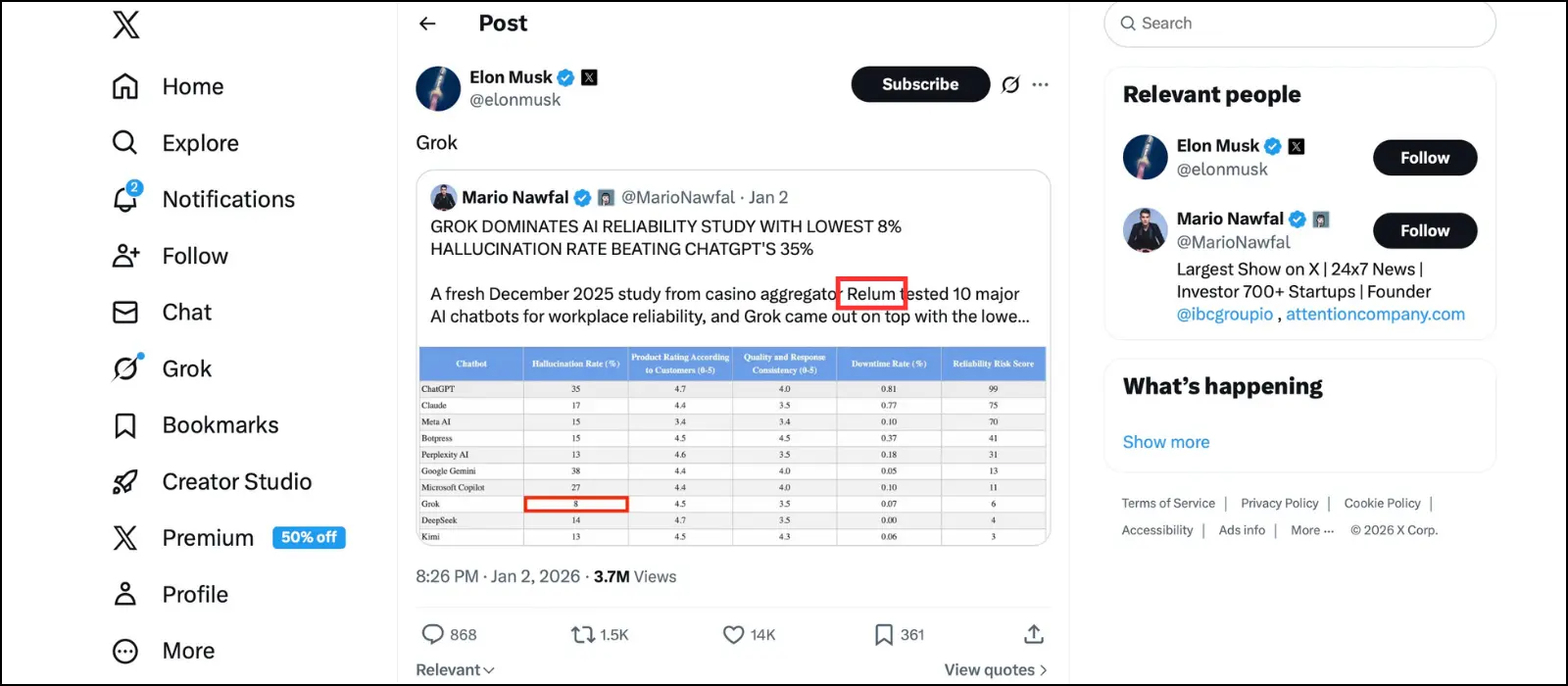 The strongest performer was the Least Reliable Chatbots study. It was picked up directly by Elon Musk on X and published across outlets in six languages. Key placements included NewsBreak (DR 83), WebProNews (DR 78), Teslarati (DR 75), and iXBT (DR 77). The remaining two campaigns extended Relum's editorial footprint across technology, sustainability, and digital innovation media.