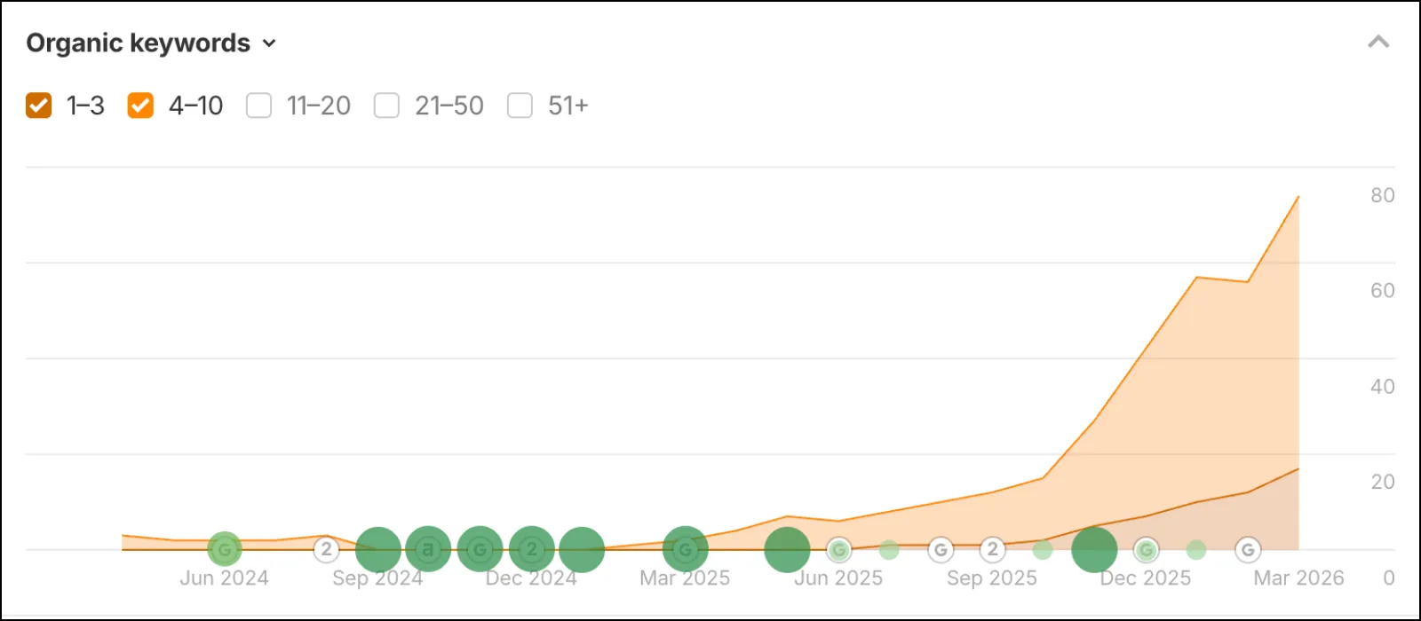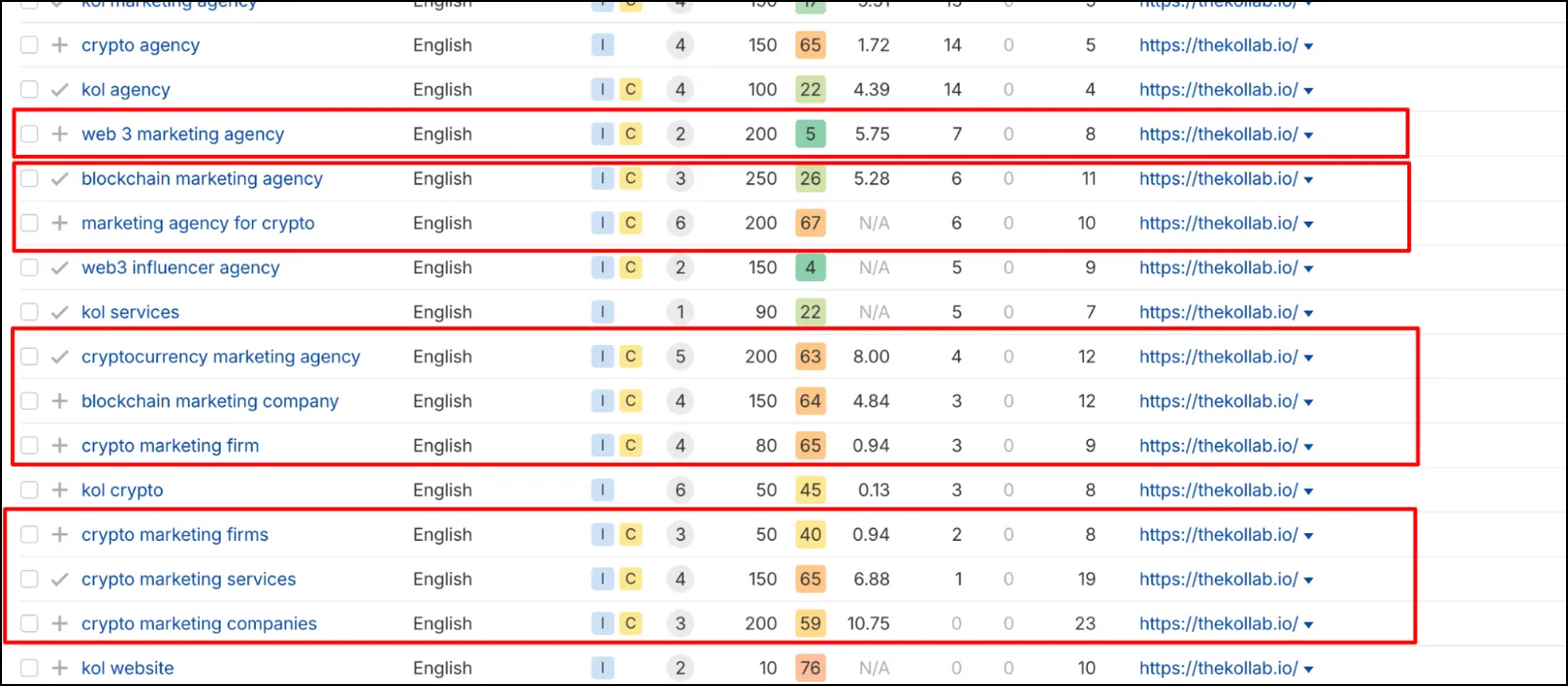 Through our content writing and optimization strategies, theKOLLAB went from 7 keywords in Google's top 10 to 74 ranking positions. At the start of the project, the homepage only ranked for KOL marketing-related keywords. Now theKOLLAB ranks for 10 crypto marketing-related keywords, including "crypto marketing agency" in position 10, "web3 marketing agency" in position 8, "crypto marketing firm" in position 9, and "blockchain marketing agency" in position 11. These are the exact terms that generate leads for the business.