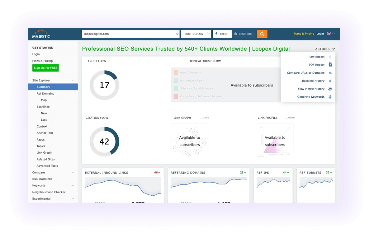 Majestic shows how a website’s authority changes over time using Trust Flow (TF, quality) and Citation Flow (CF, quantity), along with Fresh/Historic indexes and topical categories. Those distinguish real authority growth from noisy link spikes.