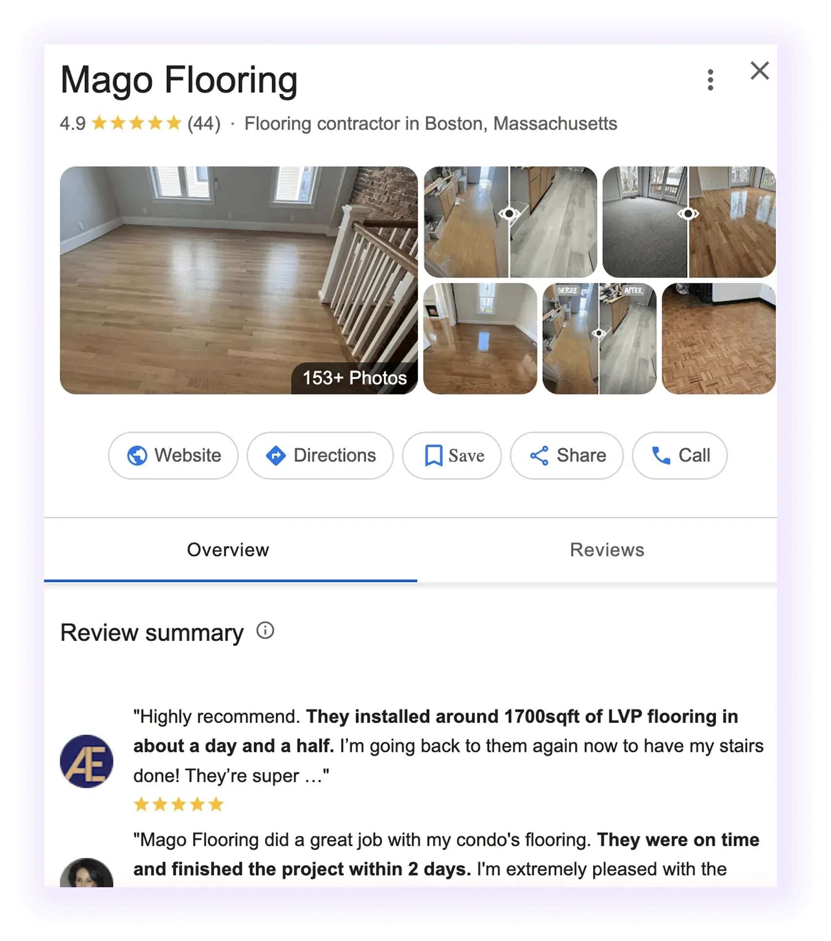 Here is an example of a well-optimized Google Business Profile for a flooring company.