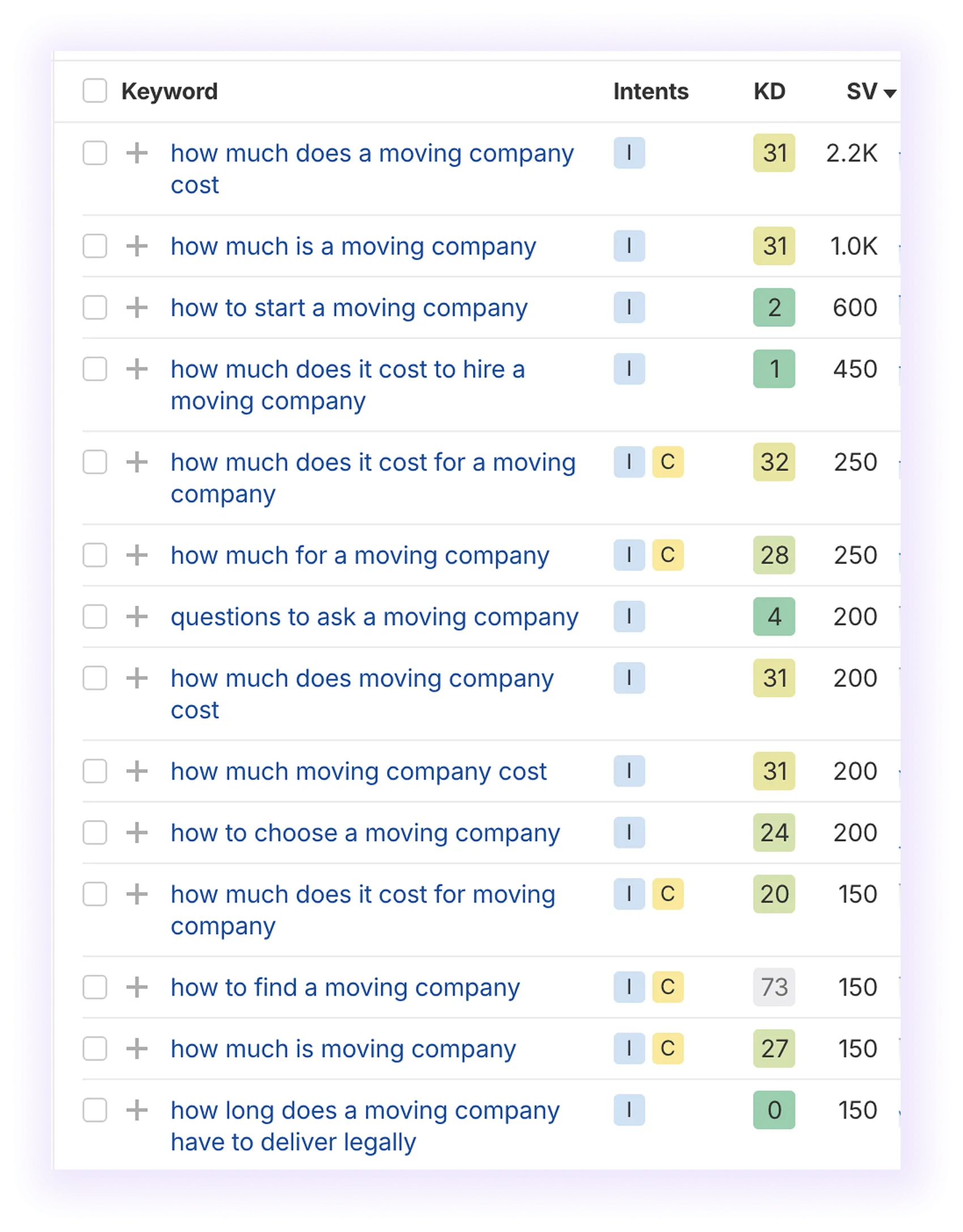 Finally, find local keywords, like “moving company nyc” or “moving services san francisco.” This shows where demand is highest and helps you prioritize the cities and neighborhoods worth optimizing for.