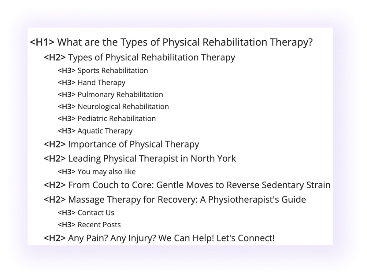 Each service page should be unique, easy to skim, and organized with proper headings (H1-H4). Speak directly to the patient’s problem, describe where they feel pain, and explain how your treatment helps. This matters even more because physiotherapy is treated as YMYL content, meaning Google looks for strong trust signals.