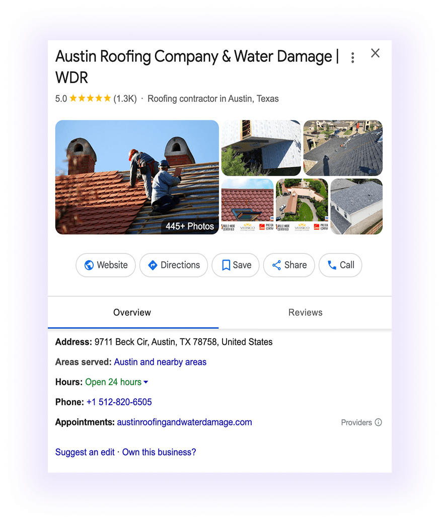 Below is an example of a well-optimized roofing company’s Google Business Profile.